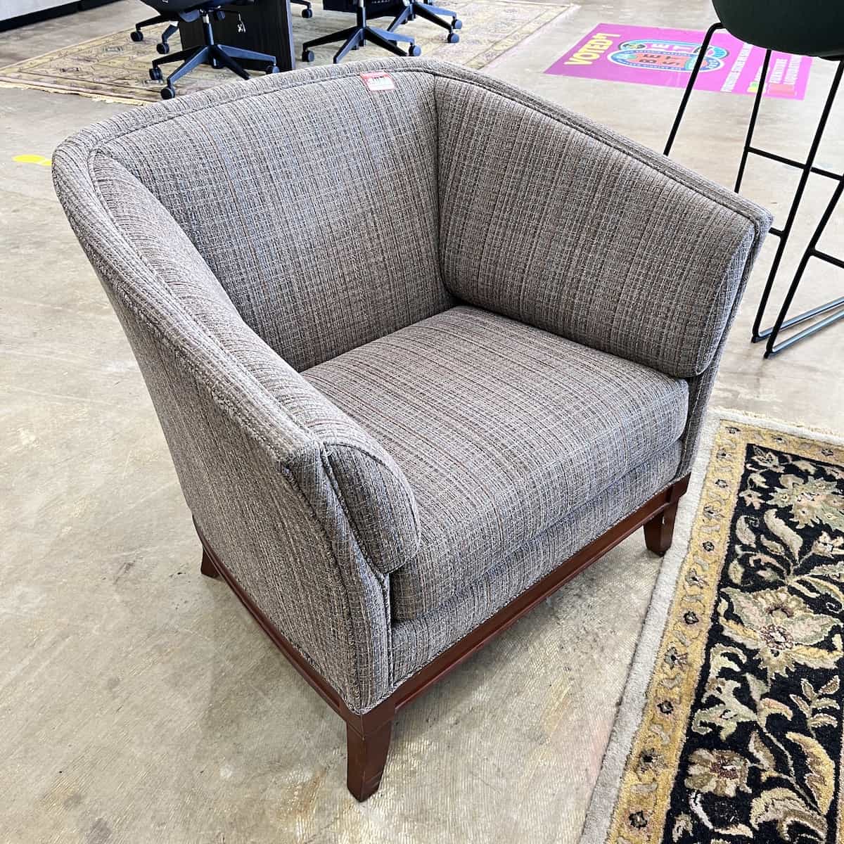 Color/Finish: grey and tan plaid chenille upholstery, cherry base