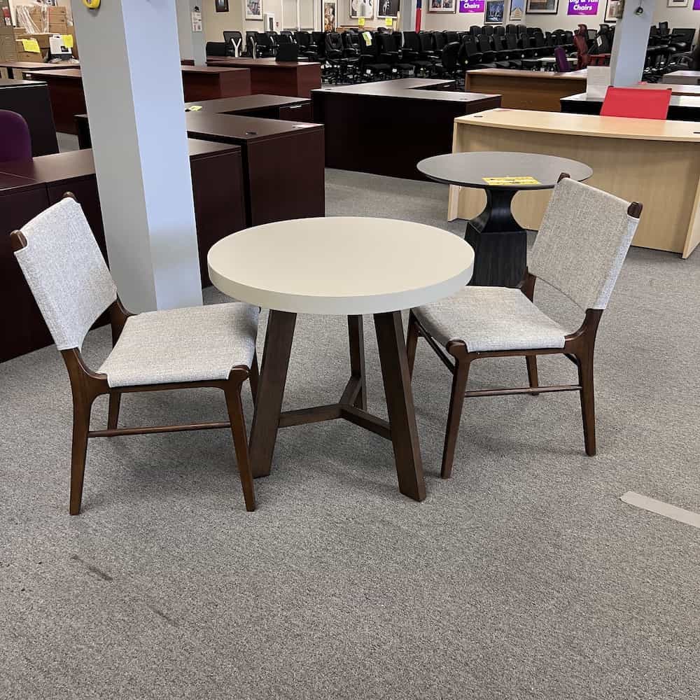 Color/Finish: walnut veneer, beige/grey upholstery, light taupe laminate round top