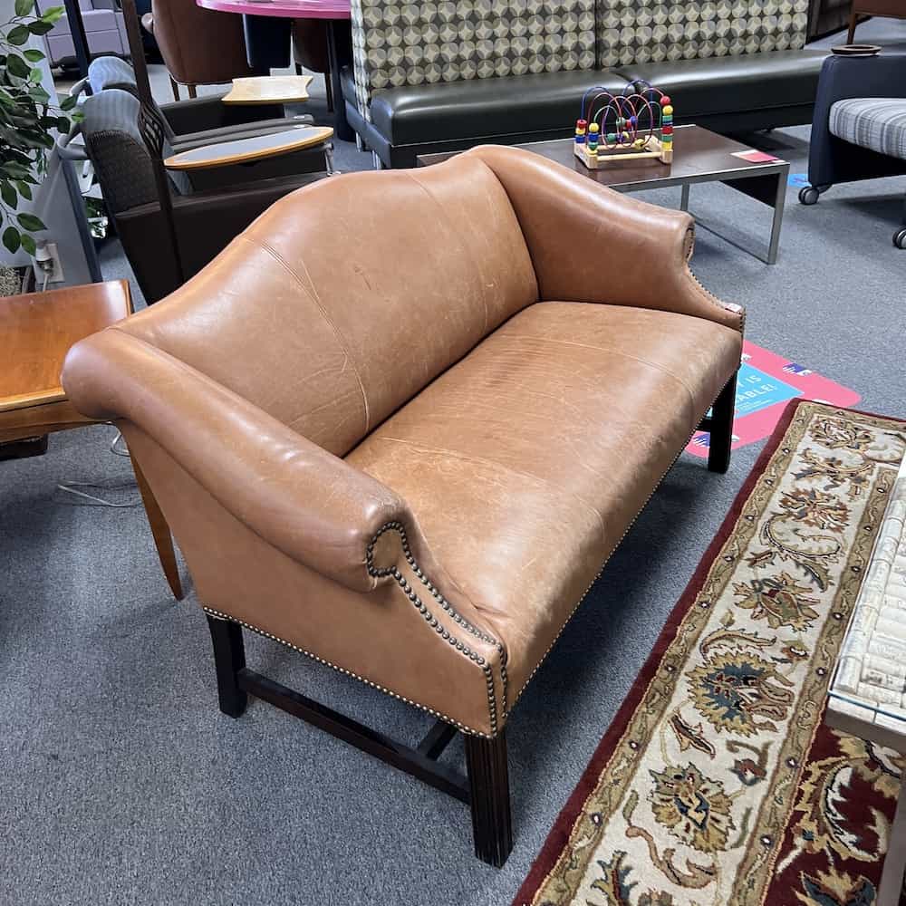 Color/Finish: camel light brown leather, gold nailheads, espresso wood legs