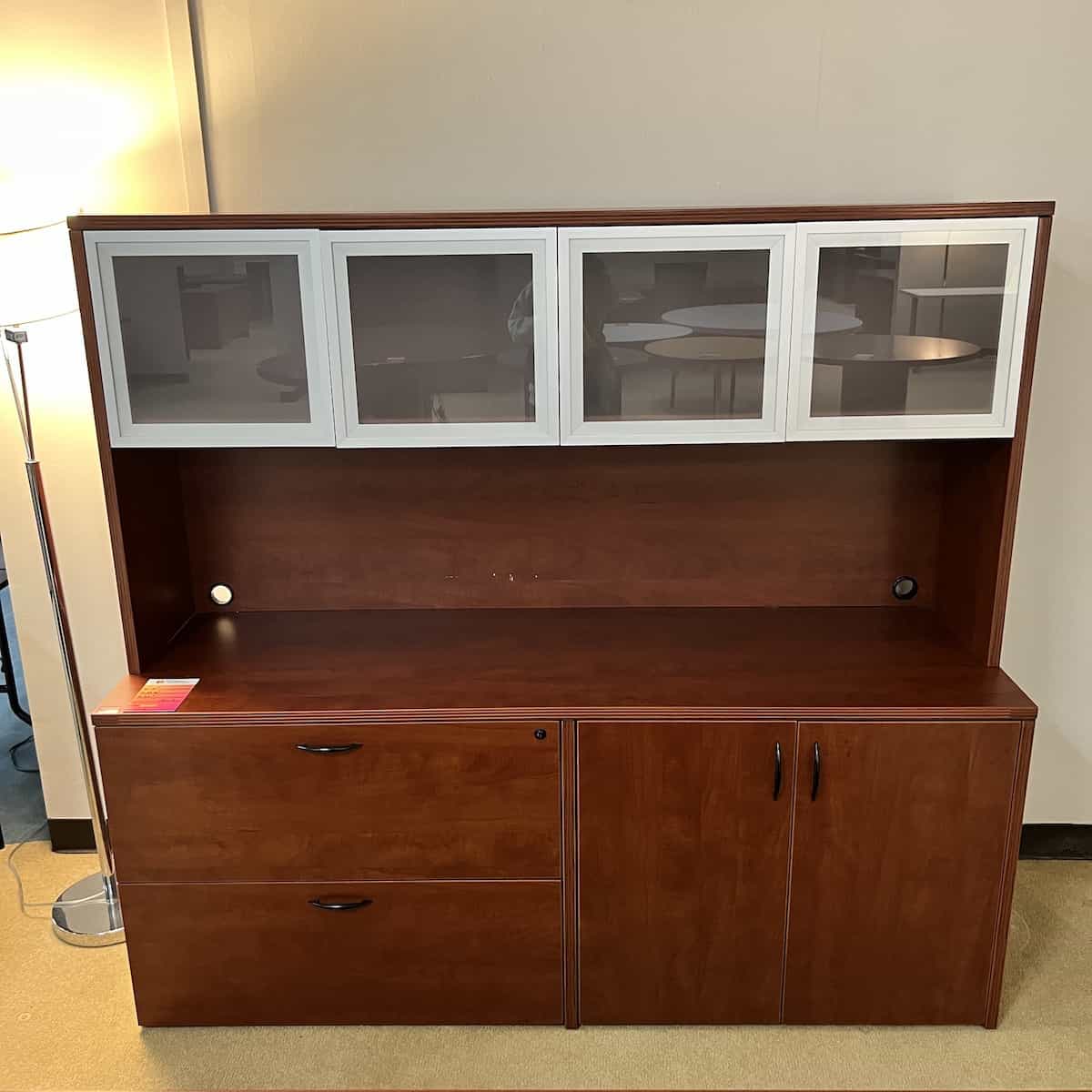 Color/Finish: Cherry laminate with black handle pulls, silver cabinet doors with glass