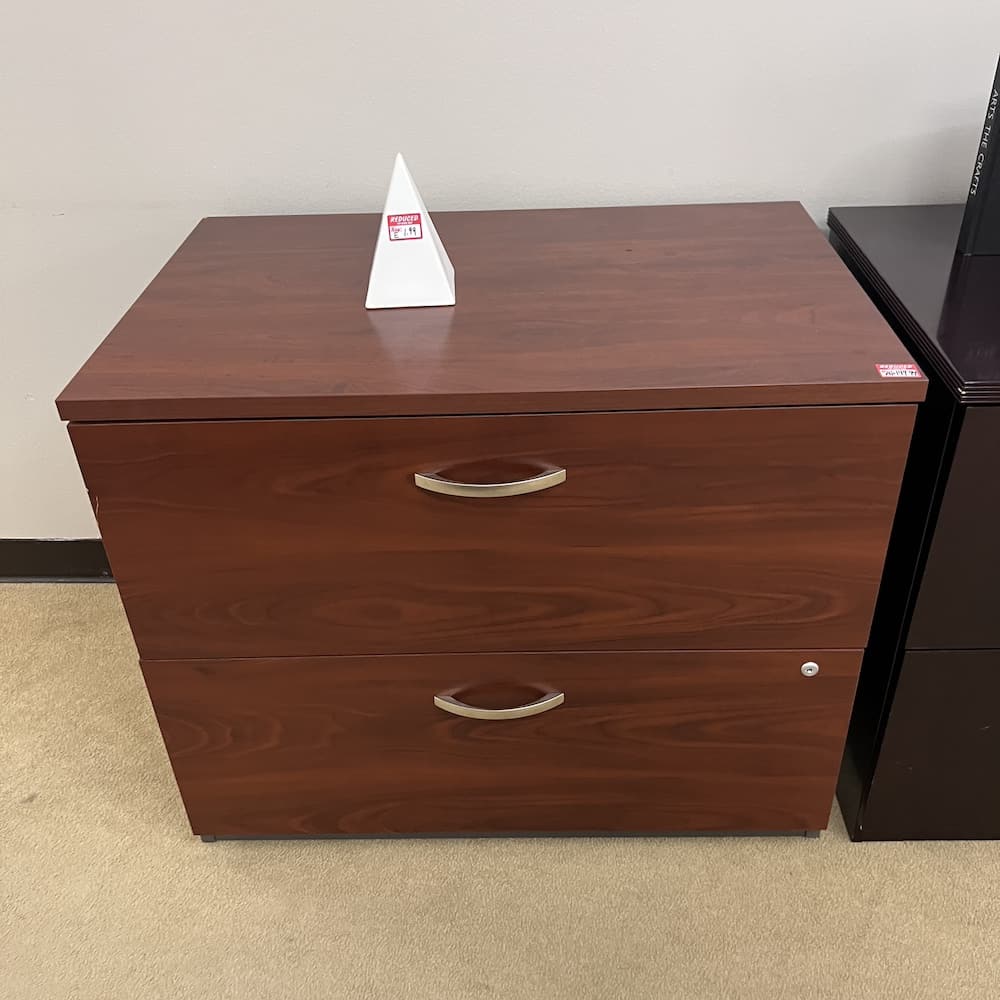 Color/Finish: cherry front and top laminate, grey flat side laminate, with silver pulls