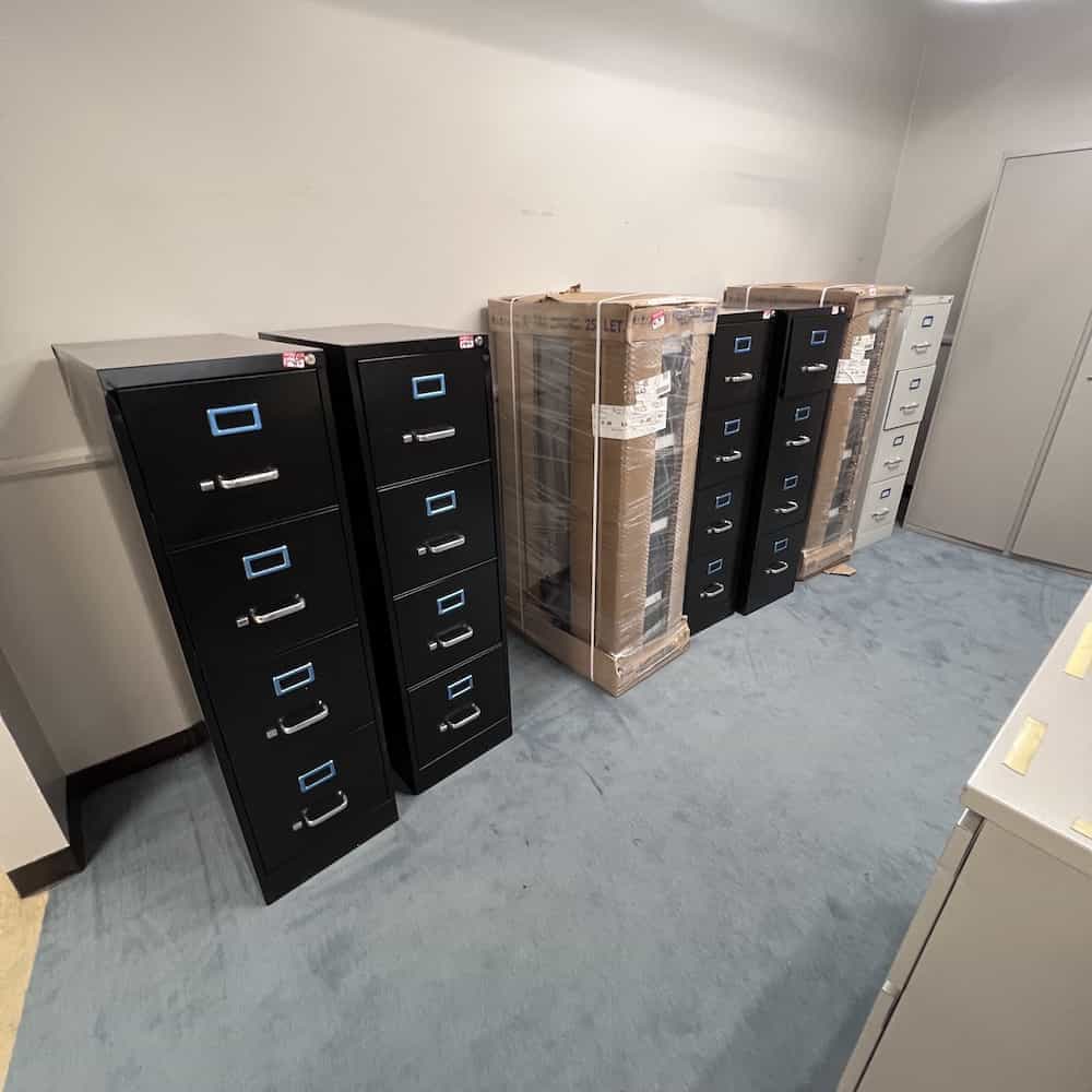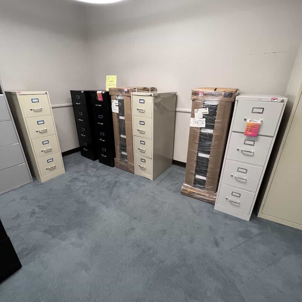 Open box vertical files will often still have the blue film on the metal label square. They are all dented. (see photos) The open box files generally DO have keys as they are new but damaged. $99.99ea.