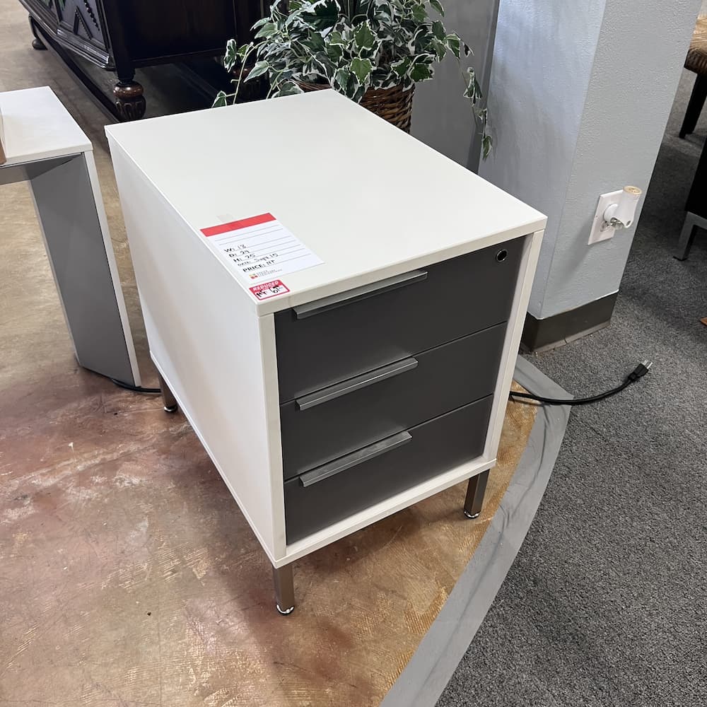 Color/Finish: white laminate outer box with grey laminate drawers and silver pulls
