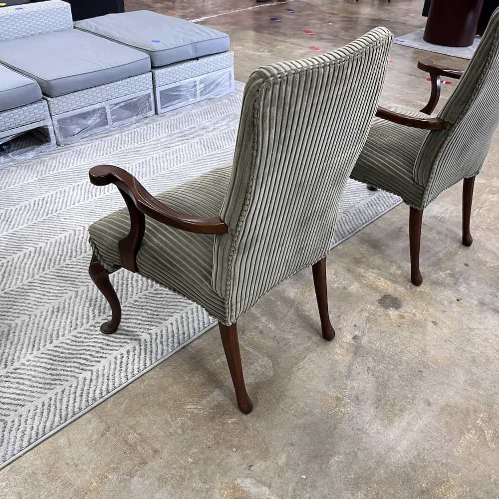 Color/Finish: Mahogany veneer arms and legs, green khaki oversized corduroy upholstery