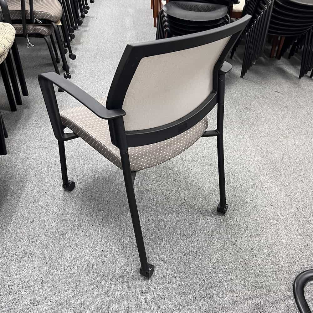 Color/Finish: taupe and white dot upholstered seat, taupe mesh back, black metal legs and arms